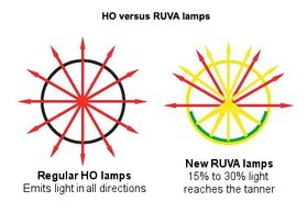 These tanning lamps are the same as the standard Dual Sun which are used to provide additional facial tanning power in beds without facial tanners, but in a RUVA configuration. To be used in the canopy with the pink section over the face and in conjunction with the Midday Sun RUVA lamps in the bench. Please be aware that no RUVA or reflector lamp should be used in any bed with wide spacing between lamps to avoid striping. Expect about 20% to 40% more UVA and UVB than the non-RUVA versions of the same lamp.